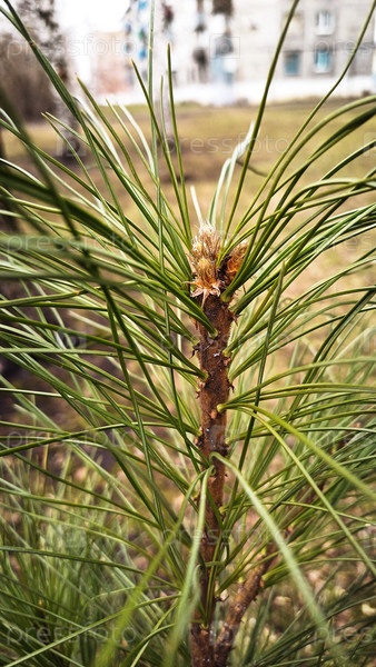 Вид на сосновые иглы и ветку в городской обстановке весеннего сезона
