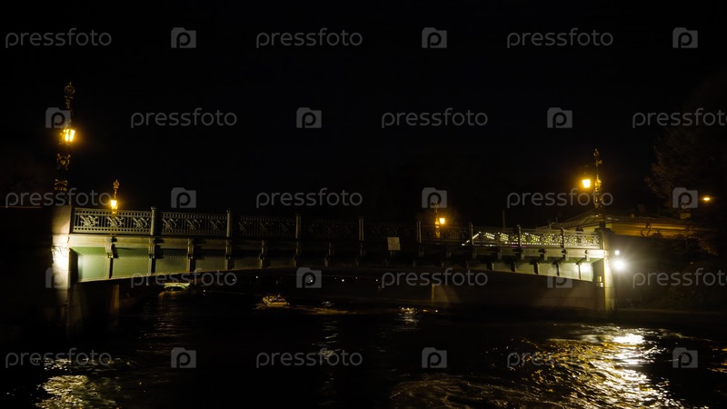 Санкт-Петербург, Россия. 2-й садовый мост. Прогулка вдоль реки Мойка. Ночная прогулка по воде в Петербурге