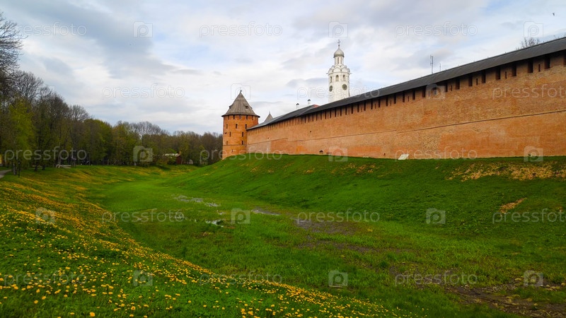 Великий Новгород, Россия. Кремлевский парк. Ров и стены новгородского кремля