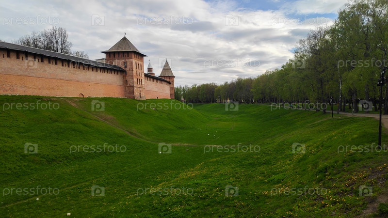Великий Новгород, Россия. Кремлевский парк. Ров и стены новгородского кремля
