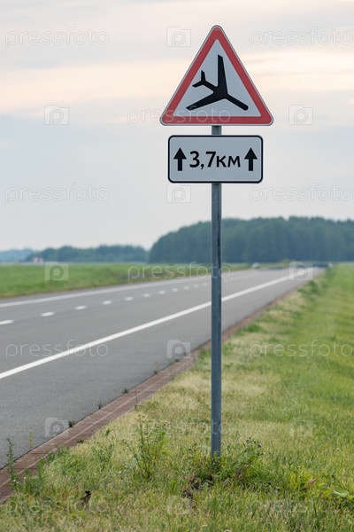 Россия. Санкт-Петербург. Дорожный знак Низколетящие самолеты на взлетно-посадочной полосе аэропорта Пулково. Россия. Санкт-Петербург. Невысоколетящие воздушные суда дорожный знак на взлетно-посадочной полосе аэропорта Пульково
