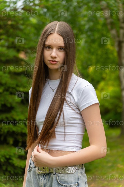 Красивая молодая девушка с длинными темно-блондинскими волосами, одетая в широкие джинсы и короткий белый верхний цвет, позирует непринужденно в солнечном летнем парке вокруг зелени