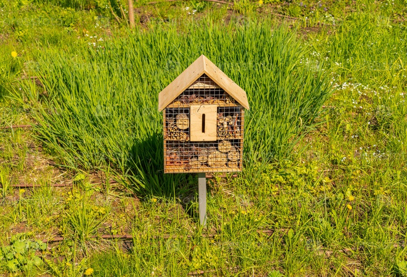 Деревянный домик для насекомых или отель для насекомых на газоне в парке. построен из экологически чистых материалов для полезных насекомых
