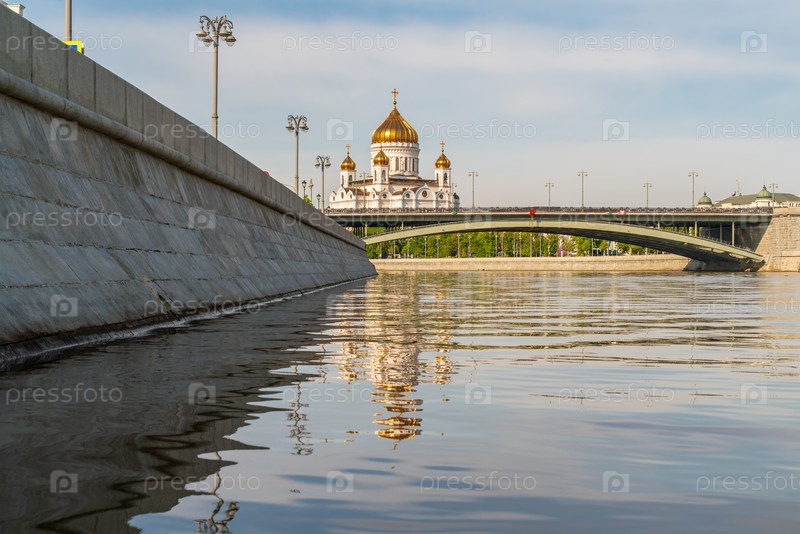 Вид на Большой каменный мост и собор Христа Спасителя. раннее весеннее утро на набережной Московской реки