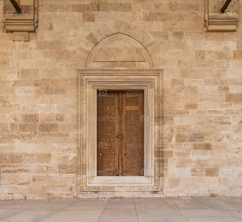 Старые резные деревянные двери с позолоченными деталями во дворе мечети.Стамбул, Турция