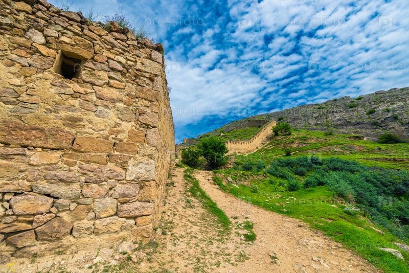 Живописный горный пейзаж с укреплением и стеной русской крепости Гуниб.Дагестан, Кавказ