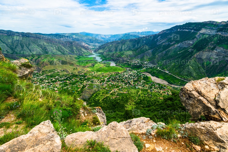 Потрясающий горный пейзаж зеленой долины горной реки с скальными образованиями на переднем плане