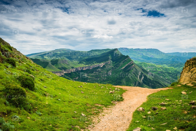 Прекрасный вид на живописные зеленые горы и крепостную стену русской крепости Гуниб.Дагестан, Кавказ