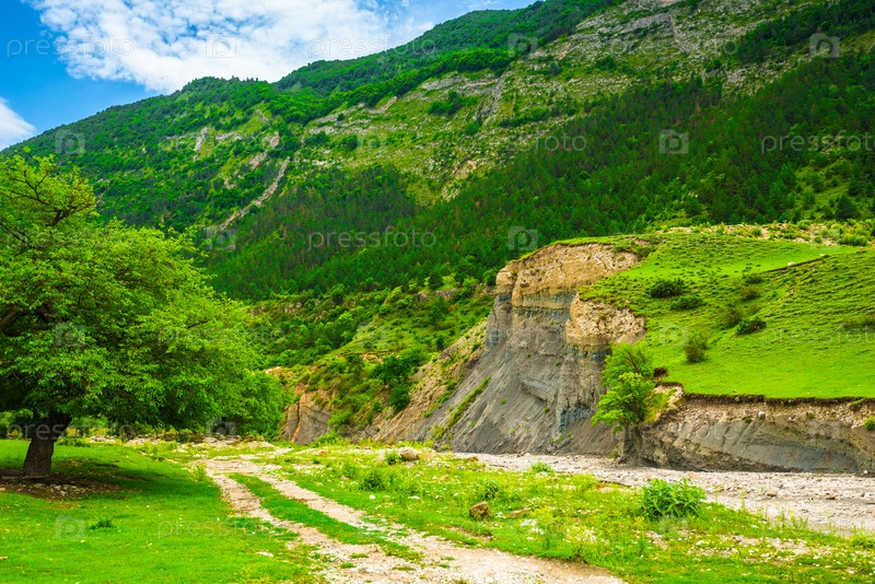 Живописный горный пейзаж с зеленым склоном и теневым деревом.Дагестан