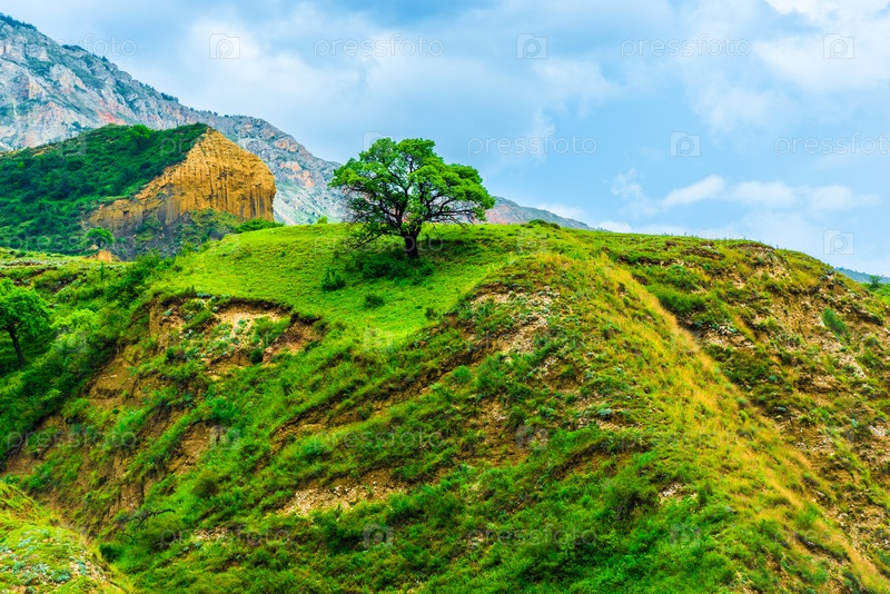 Живописный горный пейзаж с одиноким красивым деревом на вершине.Дагестан, Кавказ