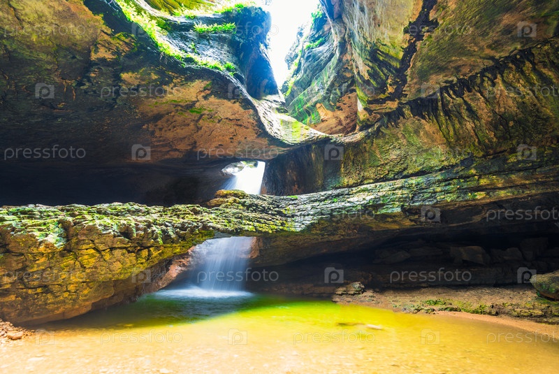 Живописный подземный водопад Солтинский и озеро в Кавказских горах
