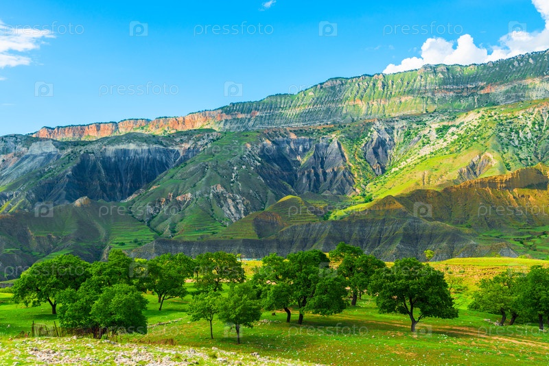 Живописный горный пейзаж с теневыми деревьями на зеленой лужайке в горах Кавказа