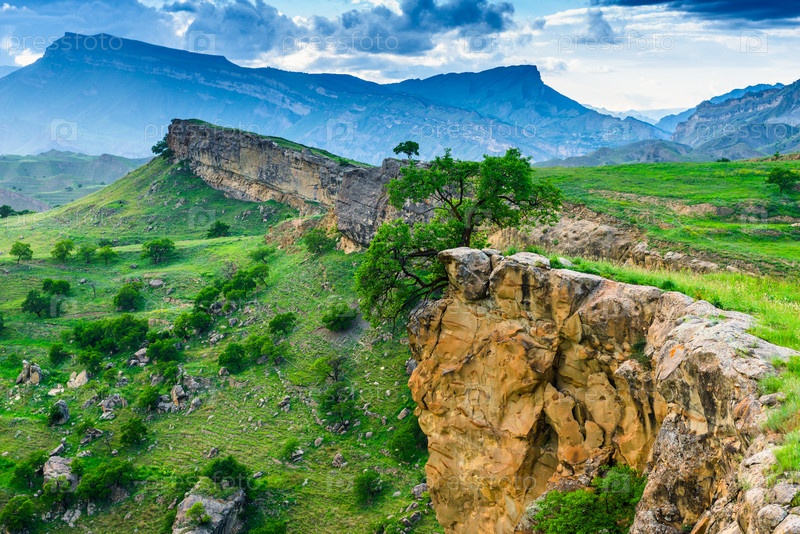 Живописный горный пейзаж с деревом на крутой скале.Северный Кавказ