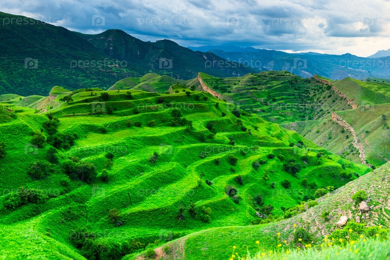 Живописный горный пейзаж с зелеными склонами террасовых гор при плохой погоде