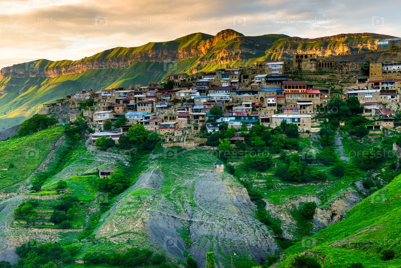 Живописный вид на горную деревню Чох в лучах заходящего солнца. Кавказ
