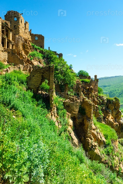 Каменные руины в горной деревне-призраке Гамсутль, на Кавказе