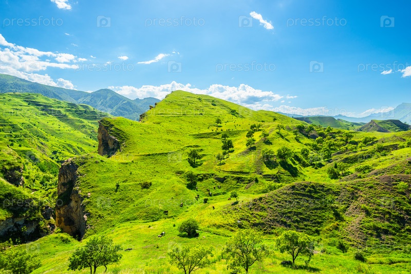 Живописный пейзаж на склоне зеленой горы с крутой скалистой породой.Северный Кавказ