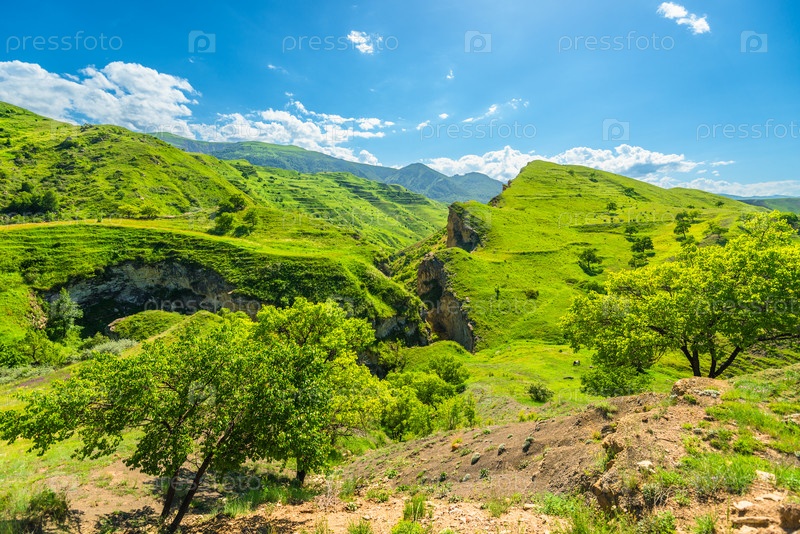 Потрясающий красивый пейзаж зеленых гор и геологического разлома. Северный Кавказ