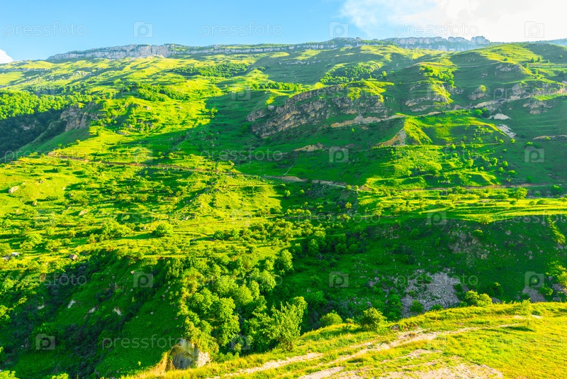 Живописный пейзаж зеленой горной долины в горах Северного Кавказа