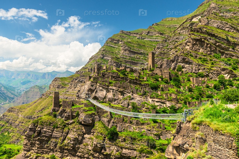 Горный висячий мост, ведущий к руинам деревни Кахиб.Современный Северный Кавказ