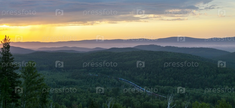 Ландшафт на рассвете. пассажирский поезд в лесу с высоты птичьего полета
