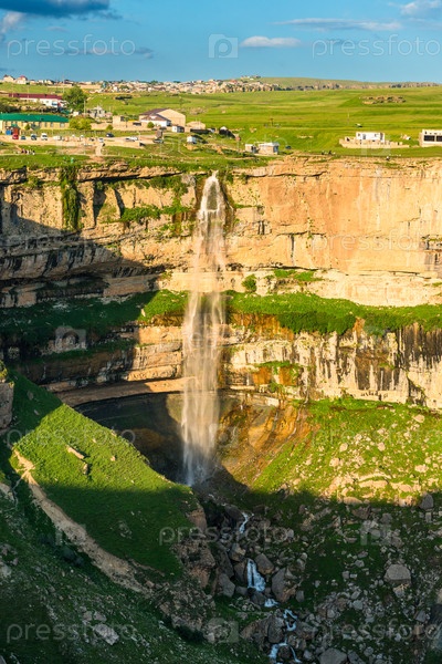 Прекрасный вид на Итальянские водопады, падающие с края крутой стены глубокого Цолотлинского каньона в горах Северного Кавказа