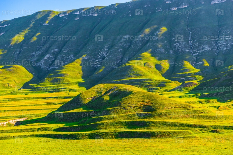Невероятно красивый вид на древние зеленые склоны горного плато с эрозией и естественными террасами геологических отложений