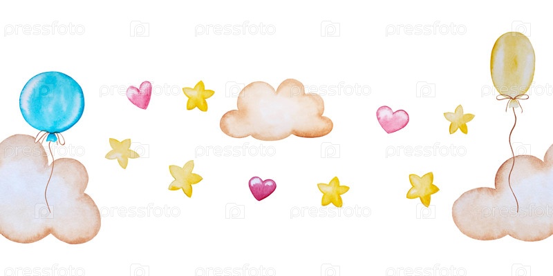 Иллюстрации акварели для детского душа с плюшевым медведем и воздушными шарами для детских поздравительных открыток, приглашений на день рождения детей, веб-сайта и упаковки