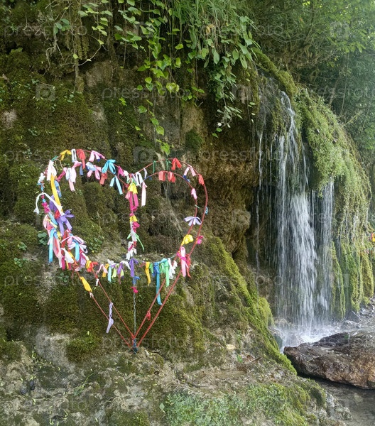 Железное сердце с красочными лентами у водопада в символическом стиле зеленого и многоцветного цвета, символизирующих любовь и духовность