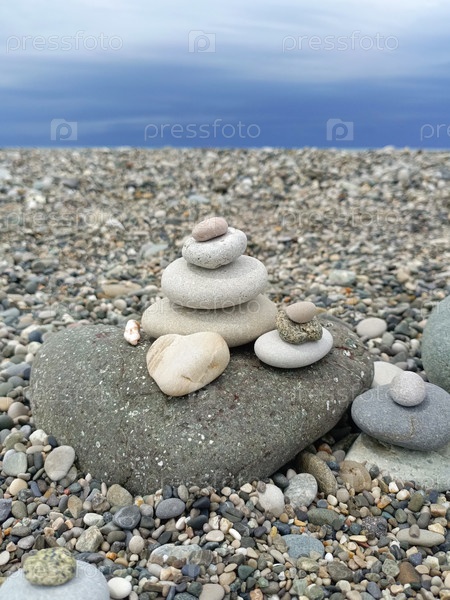Сбалансированные стеки гладких серых камней в минималистическом стиле, представляющие собой медитацию и гармонию