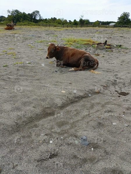 Красно-коричневая корова спокойно отдыхает на песчаном пастбище