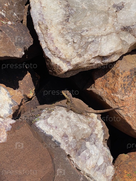 Ящерица сидит на скале рядом с естественным аметистом.Природный фон.Минас-де-Ванда, Аргентина