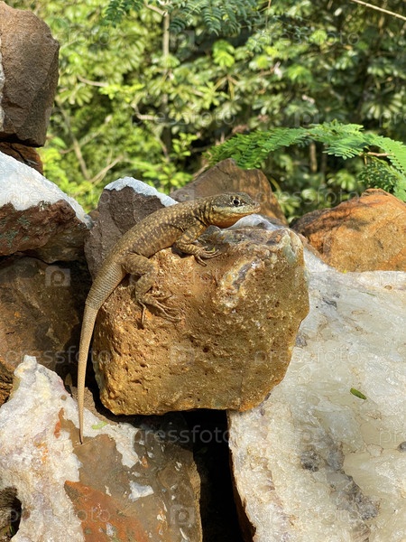 Ящерица сидит на скале рядом с природными кристаллами аметиста