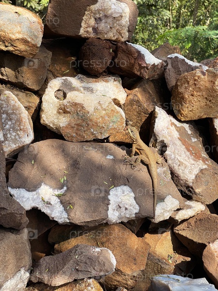 Ящерица сидит на скале рядом с природными кристаллами аметиста