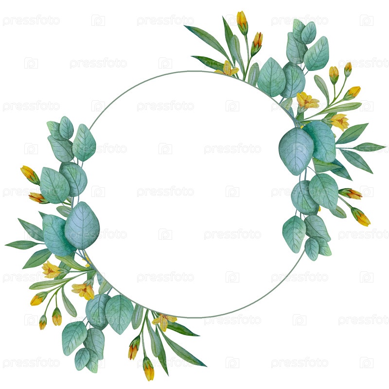 Коллекция акварели ручной живописи эвкалиптовых листьев и желтых диких цветов. Ботанические элементы клипарта выделены на белом фоне. Набор объектов для декора, дизайна, плаката, баннера, свадьбы, логотипа