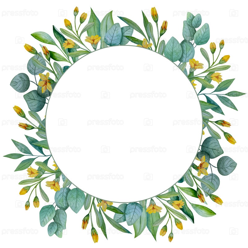 Коллекция акварели ручной живописи эвкалиптовых листьев и желтых диких цветов. Ботанические элементы клипарта выделены на белом фоне. Набор объектов для декора, дизайна, плаката, баннера, свадьбы, логотипа