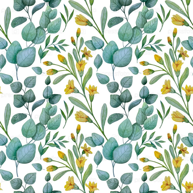 Коллекция акварели ручной живописи эвкалиптовых листьев и желтых диких цветов. Ботанические элементы клипарта выделены на белом фоне. Набор объектов для декора, дизайна, плаката, баннера, свадьбы, логотипа