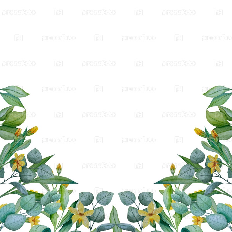 Коллекция акварели ручной живописи эвкалиптовых листьев и желтых диких цветов. Ботанические элементы клипарта выделены на белом фоне. Набор объектов для декора, дизайна, плаката, баннера, свадьбы, логотипа