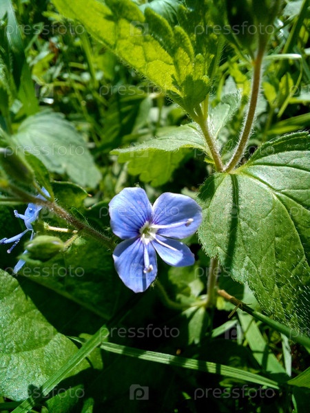Нежный синий цветок, распускающийся среди пышного зеленого листья в солнечном саду