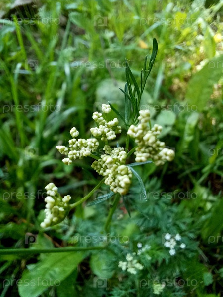 Дикое цветущее растение с зелеными стеблями и кластерами зарождающихся белых цветов в естественной обстановке днем