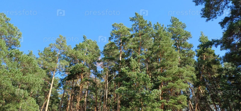 Сосновые деревья достигают чистого голубого неба в тихом лесу в солнечный день