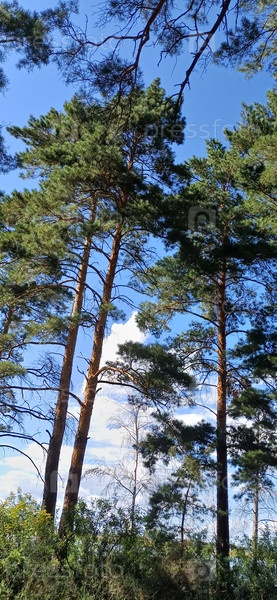 Высокие сосны под чистым голубым небом в спокойном лесу в полдень. фото высокого качества