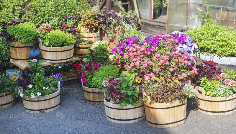 Сад полон деревянных ванн с цветами и травами, красивый цветущий летний сад