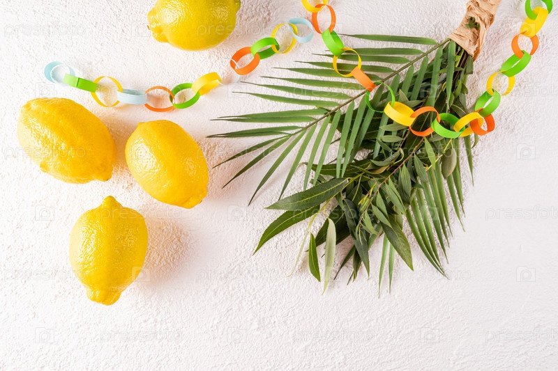 Композиция для праздника суккота, сбор плодов. Традиционные символы праздника на белом цвете. Многоцветные гирлянды. вид сверху