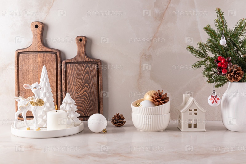 Стильный вид современной кухонной мраморной столешницы для нового праздника с различными декорациями в белых, золотых цветах с фронтальным видом.Минимализм во внутреннем интерьере