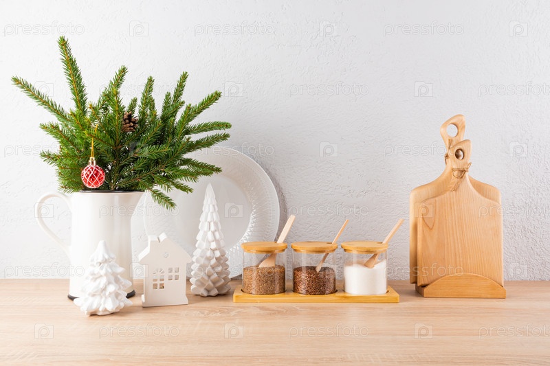 Деревянные ветви в кружке, банки для хранения специй, набор режущих досок на деревянной столешнице во внутренней части рождественской кухни. минимализм