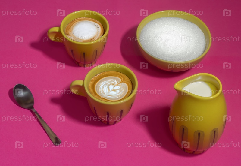 Чашки для латте на розовом фоне, желтый и белый