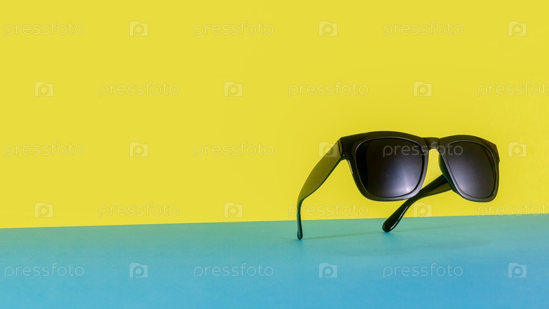 Подвешенные солнцезащитные очки на красочном сине-желтом фоне