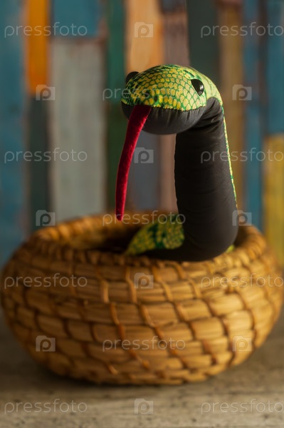 Милая игрушечная змея, поднимающаяся из корзины