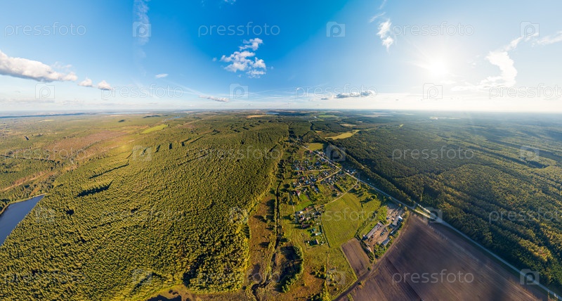 Екатеринбург, Россия. Панорама лесных массивов. Хвойные леса. Деревня и оробленное поле. Время захода солнца. Вид с воздуха